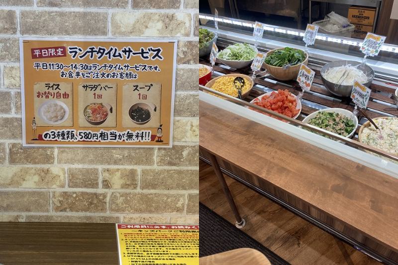 単品メニューを注文するとライスお替り自由、サラダバー(1回)、スープ(1回)の580円相当が無料でついてきます。