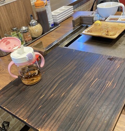 テーブルは机に鉄板が備え付けられているタイプでちょっと危険。子供向けには木の板を配置してくれるあたり、安全面の配慮を感じます。